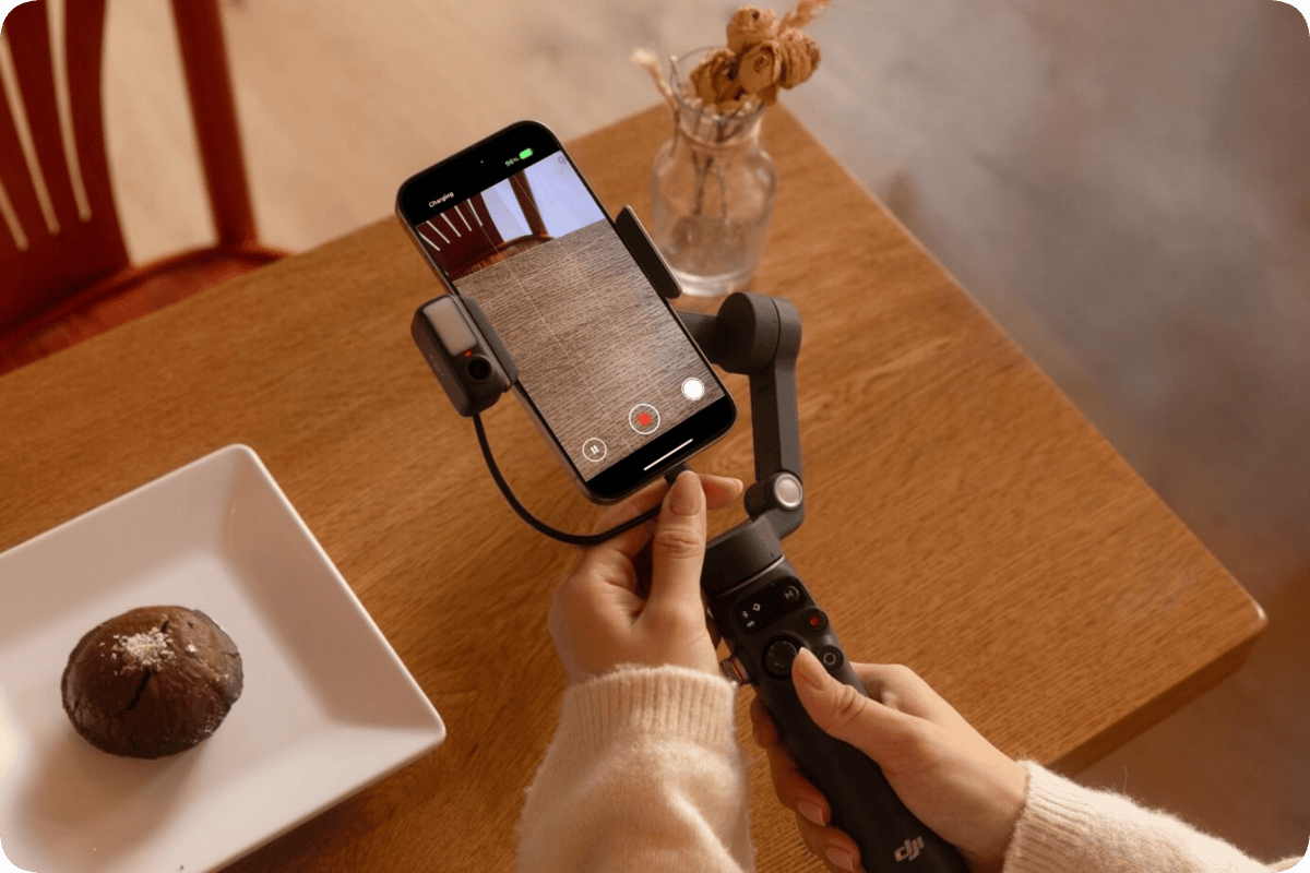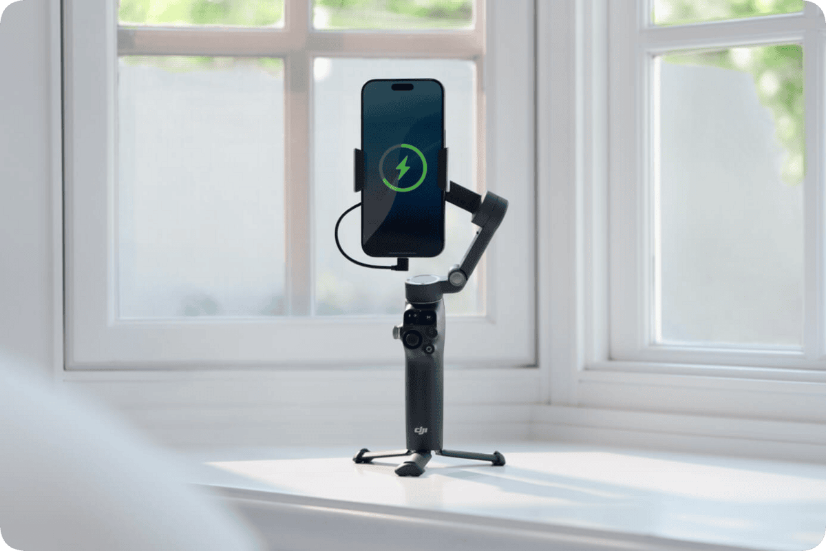 Когда придёт вдохновение, ждать не нужно. Просто положите телефон [1] на зону NFC-датчика на рукоятке стабилизатора, чтобы подключить его по Bluetooth. После магнитной фиксации телефона мгновенно активируется режим следования.
