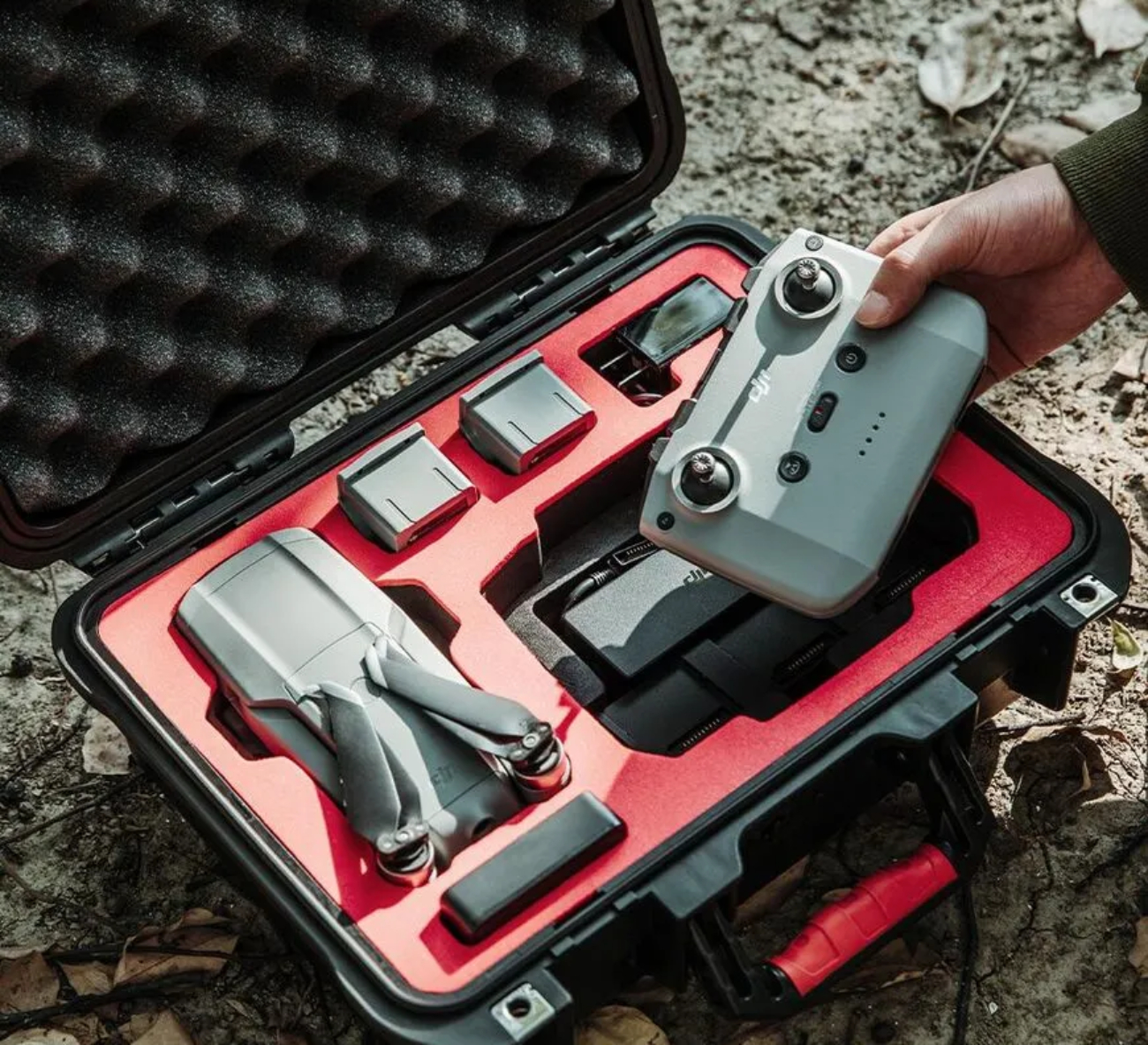 Внутренняя часть оснащена плотной пеной с вырезами по форме дрона и аксессуаров, обеспечивая надёжную фиксацию и предотвращая их перемещение во время транспортировки. Кейс позволяет удобно хранить пульт управления, аккумуляторы, пропеллеры, кабели и другие аксессуары, всё под рукой и в порядке.